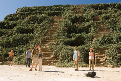 その後、ジャングルの中を歩いて向かうと、茂みに隠された道の先にマヤ文明の遺跡と思われるピラミッドを発見する。